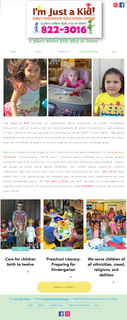 Building a webpage that looks good is not easy. It's even harder when you don't have much time to do it. Fortunately, with the help of the right team, it is possible to successfully redesign a homepage. I'm Just a Kid!is an early childhood education center that offers daycare services with a custom curriculum. We started this partnership to quickly acquire new students and grow the I'm Just a Kid!'s brand. With a tight turnaround on this goal, we needed to get started quickly, and the first step was to have a website where we could direct these new students' parents. We changed our process for designing this new homepage. We had to do this because we needed to find a new look and feel for the brand, and also redesign the homepage in a short amount of time. We started with the image below, which is I'm Just a Kid!'s old homepage. /*! elementor - v3.9.1 - 14-12-2022 */
