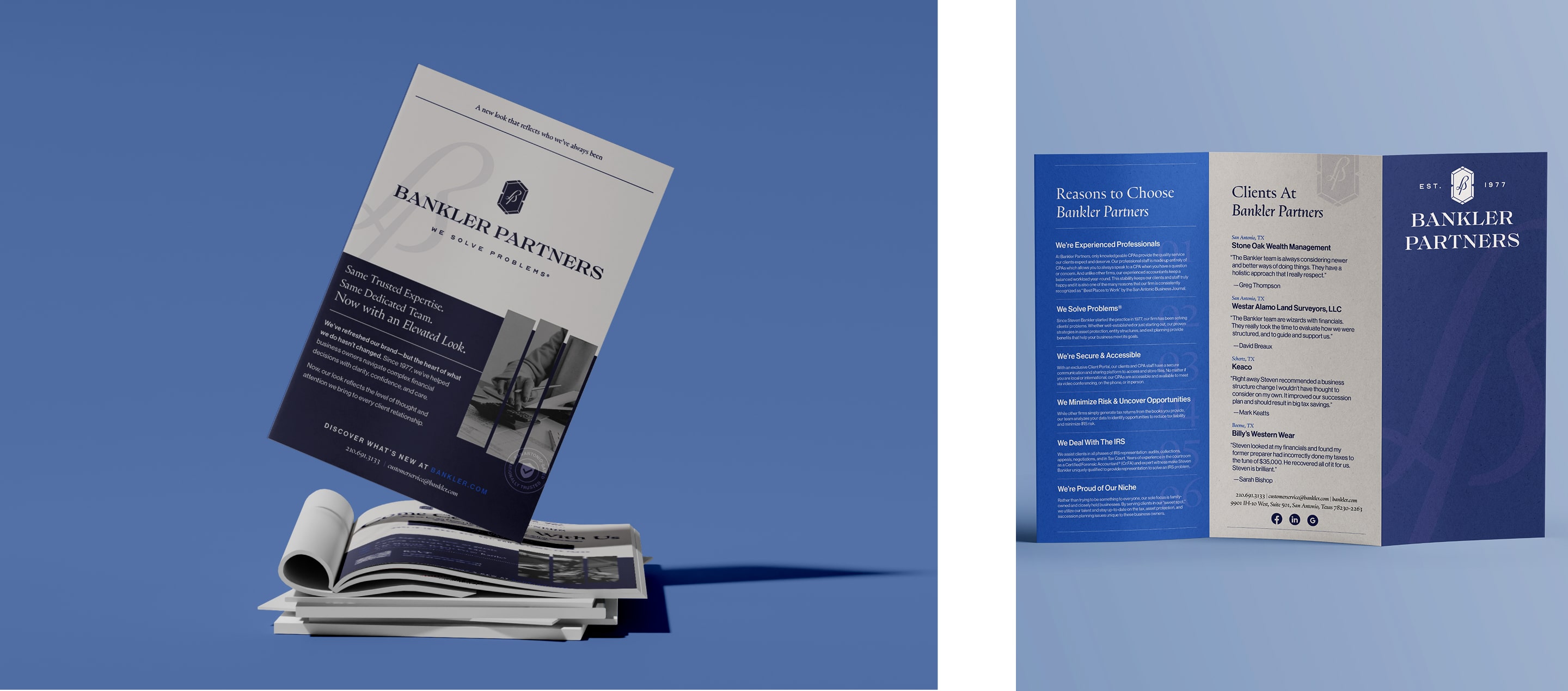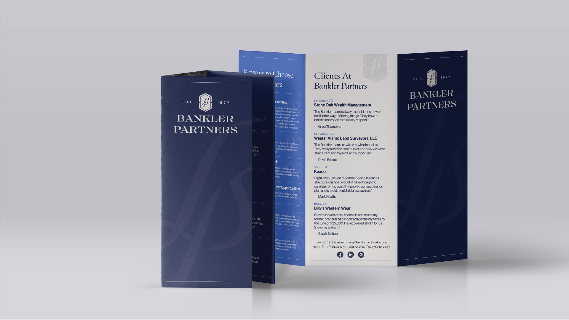 Tribu Creative partnered with Bankler Partners to elevate their brand into a modern, sophisticated identity that reflects their decades of expertise. We redesigned their logo with an upscale, timeless feel, establishing a mark that communicates trust, precision, and professionalism. From there, we built a refreshed visual system—colors, typography, and branded assets—that strengthened their overall presence.